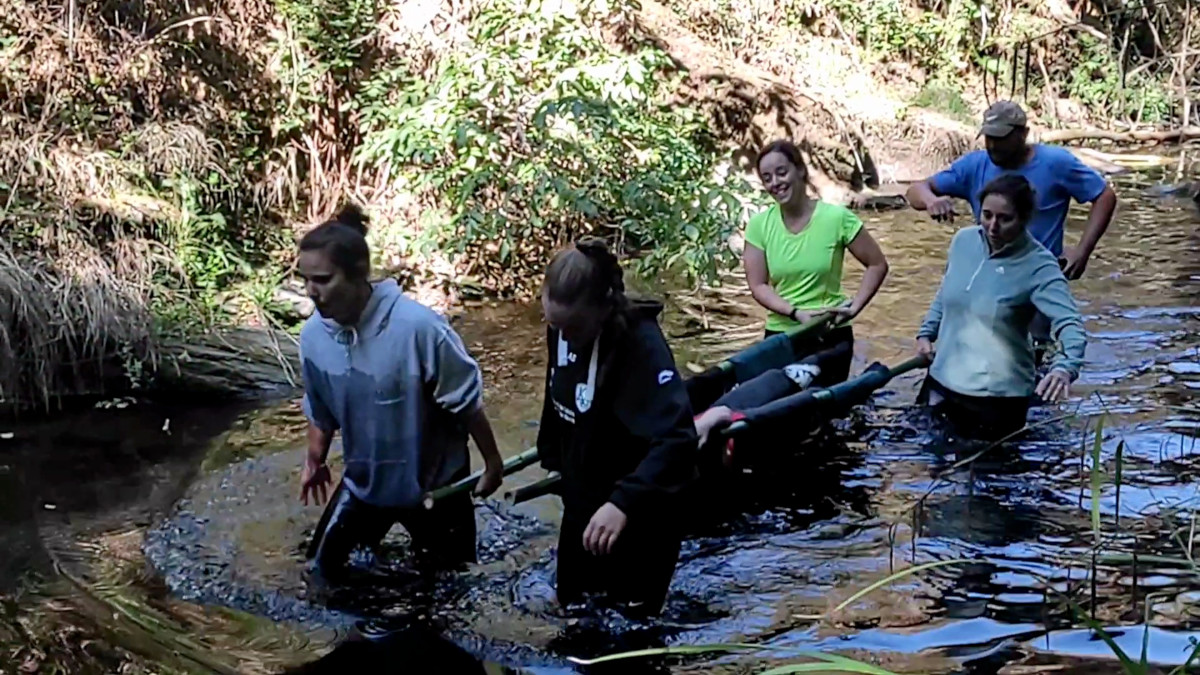 – Le ruisseau en relais. Les équipes devront décider du placement de chacun de ses membres. Côte à côte sur la ligne de départ, un représentant de chaque équipe chargé d’un sac à dos en guise de relais devra le passé à son partenaire déjà positionné en amont.
